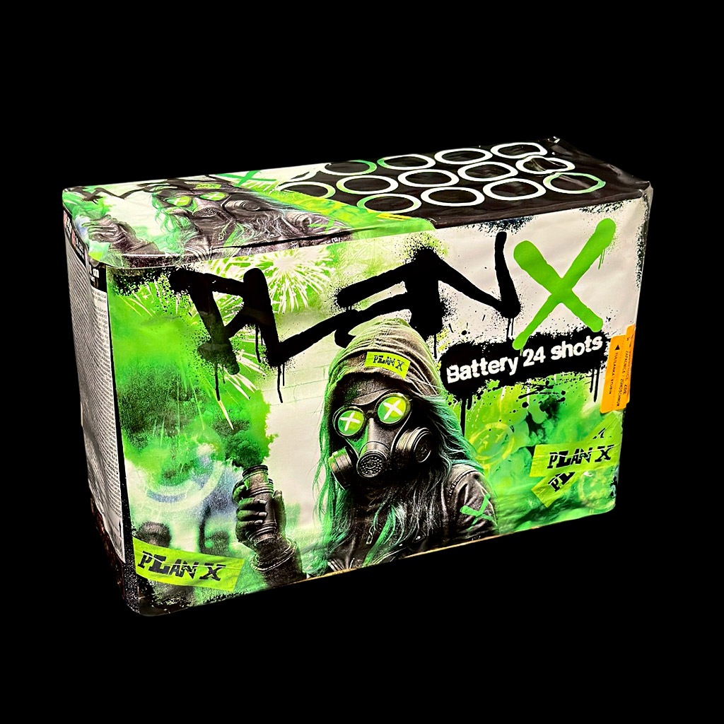 The Plan X compact cake fires 24 vertical shots with a 36 mm caliber, producing a strong and loud display that lasts just 23 seconds. Each burst fills the sky with color and sound, delivering a high-impact performance. With its fast pace and intense finale, it’s ideal as a short standalone show or a powerful closing effect.
